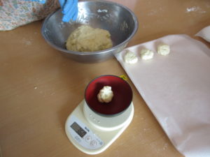 おまんじゅうの皮は一つ一つ重さをはかって分けていきます。