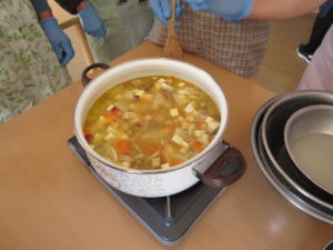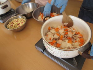 みんなで刻んだ材料を鍋で炒めて、煮込みました。