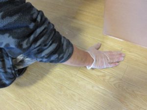 小さなスポンジを使って床を磨いているんですが、男性陣は手が大きいので写真だとスポンジが見えないですね・・・。