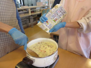ご利用者の皆様の作っていただくのは、「野菜たっぷり豆乳スープ」「黒糖まんじゅう」です。