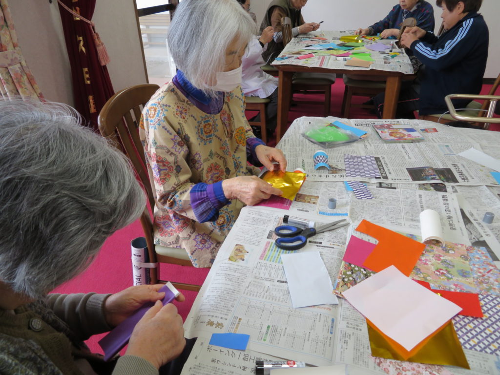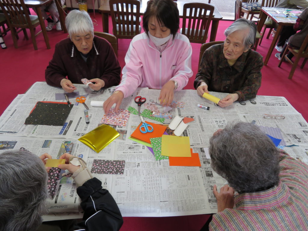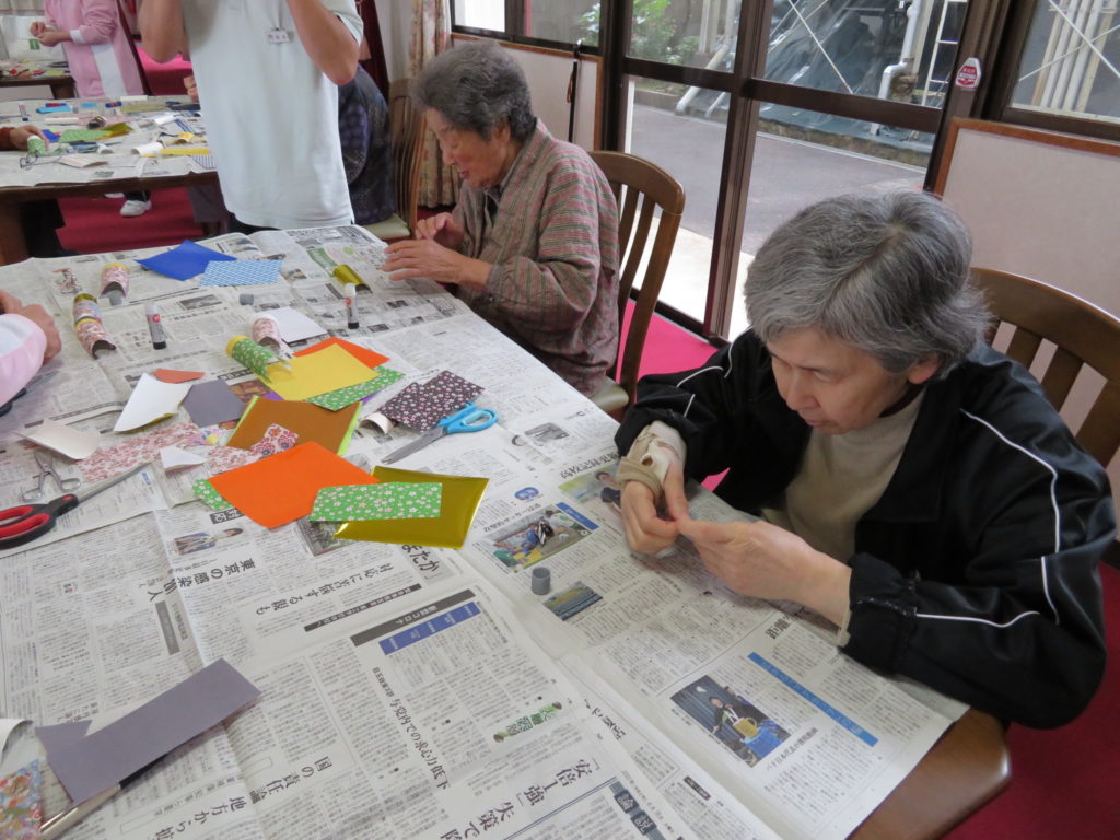 おもいおもいの形に切って、色とりどりの折紙を貼っていきますφ(゜▽゜*)♪