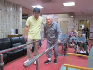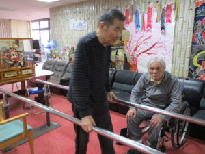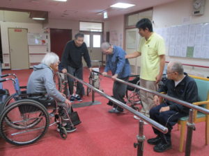 平行棒を使っての歩行訓練と立ち上がり訓練