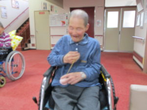 お手玉を手のひらではじいたり しっかりと捕まえたりして 指先~腕の運動を楽しまれています