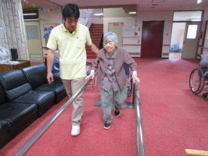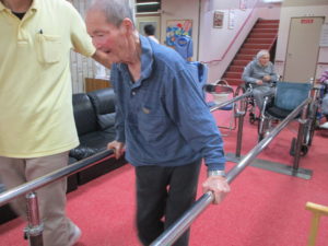 平行棒を使っての歩行訓練と立ち上がり訓練
