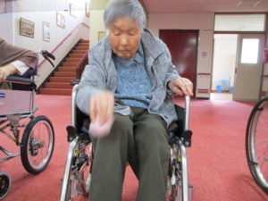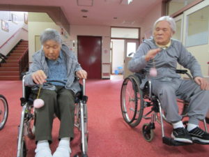 お手玉を手のひらではじいたり しっかりと捕まえたりして 指先~腕の運動を楽しまれています