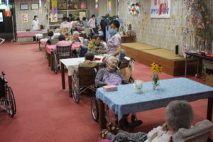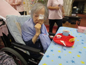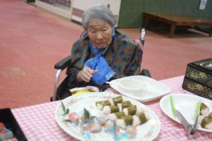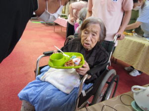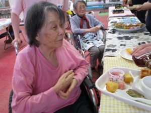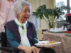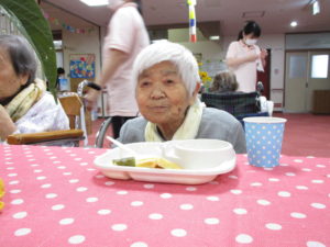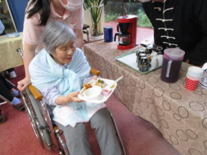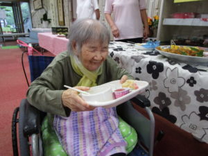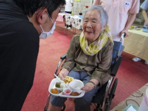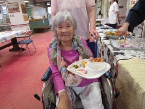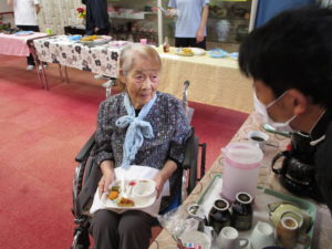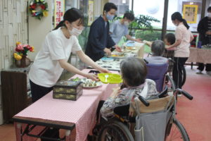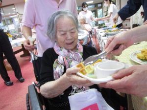 調理職員さんも皆さんの皿におやつを乗せてバイキングのお手伝い