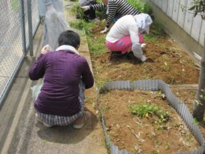 施設の門付近と畑の雑草を、一本一本手作業で抜いています。大変!!