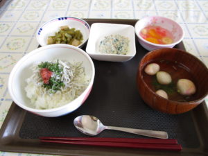 その他のメニューは 清汁 白和え 芋づるの煮物 フルーツポンチ