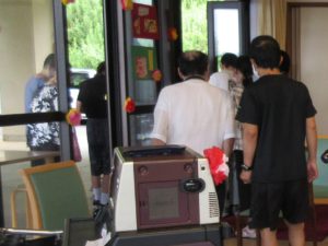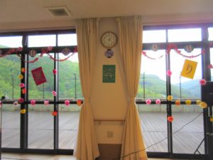 ご利用者手作りの提灯飾り、ペーパーフラワーでいつもの食堂も華やいでいます。