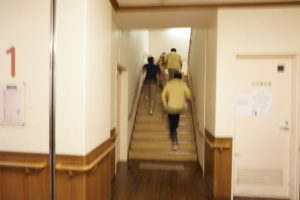 報告を受けて・・・・防災センターとなっている当施設の事務所より、手袋、スコップ、バール、ジャッキ、木片、毛布などを持った職員が3階へ救助に走ります!