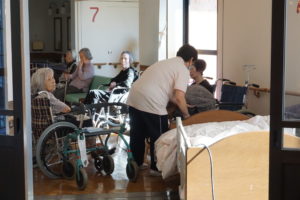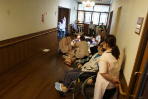 皆さん、どうにか所定の場所に集合できました。起き上がることが出来ない入所者様はベッドのまま移動していただきました。