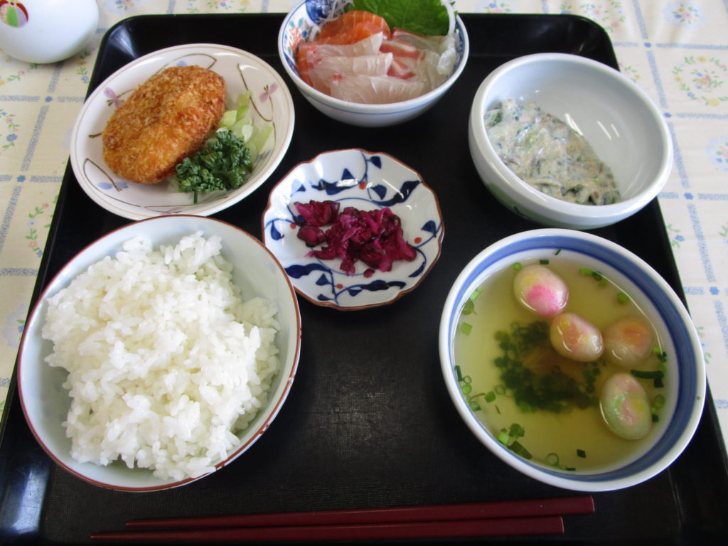 皆さん「刺身の新鮮で美味しかよ」「鮭のコロッケって珍しかね」と言われ食べておられました(^^♪