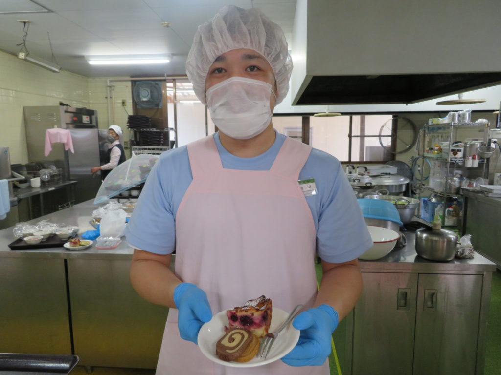 今回は、調理員さんのアレンジでフルーツは「三種のベリー(ブルーベリー、ラズベリー、ストロベリー)に林檎を使いました。たっぷりのフルーツでしっとりとした食感、生地とフルーツが一体化して美しい層になっています✨