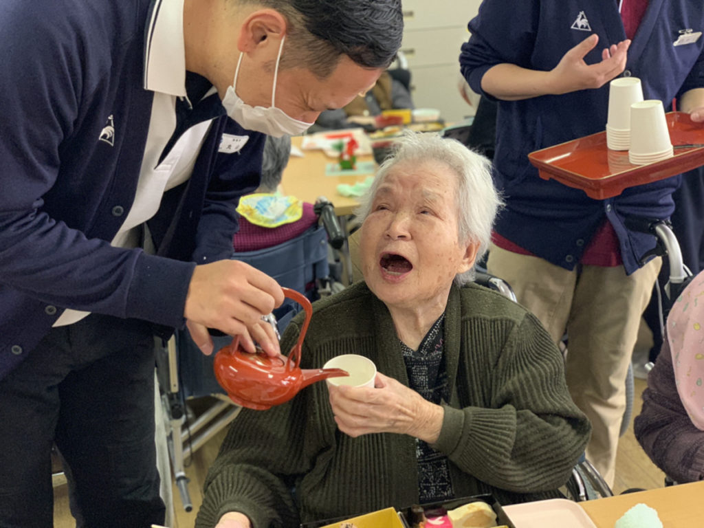 例年だと1階で利用者様、職員全員でおせち料理をいただくのですが、