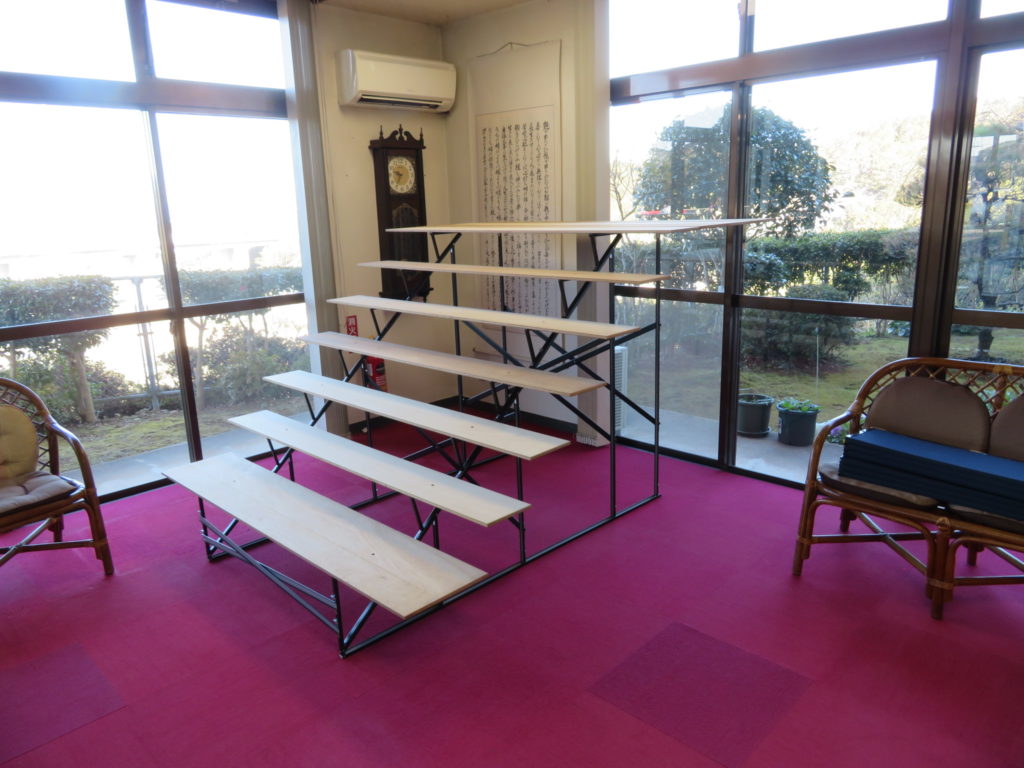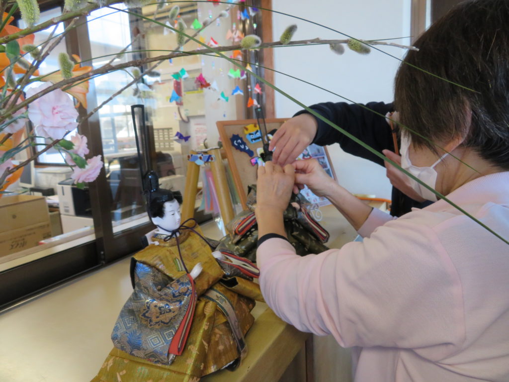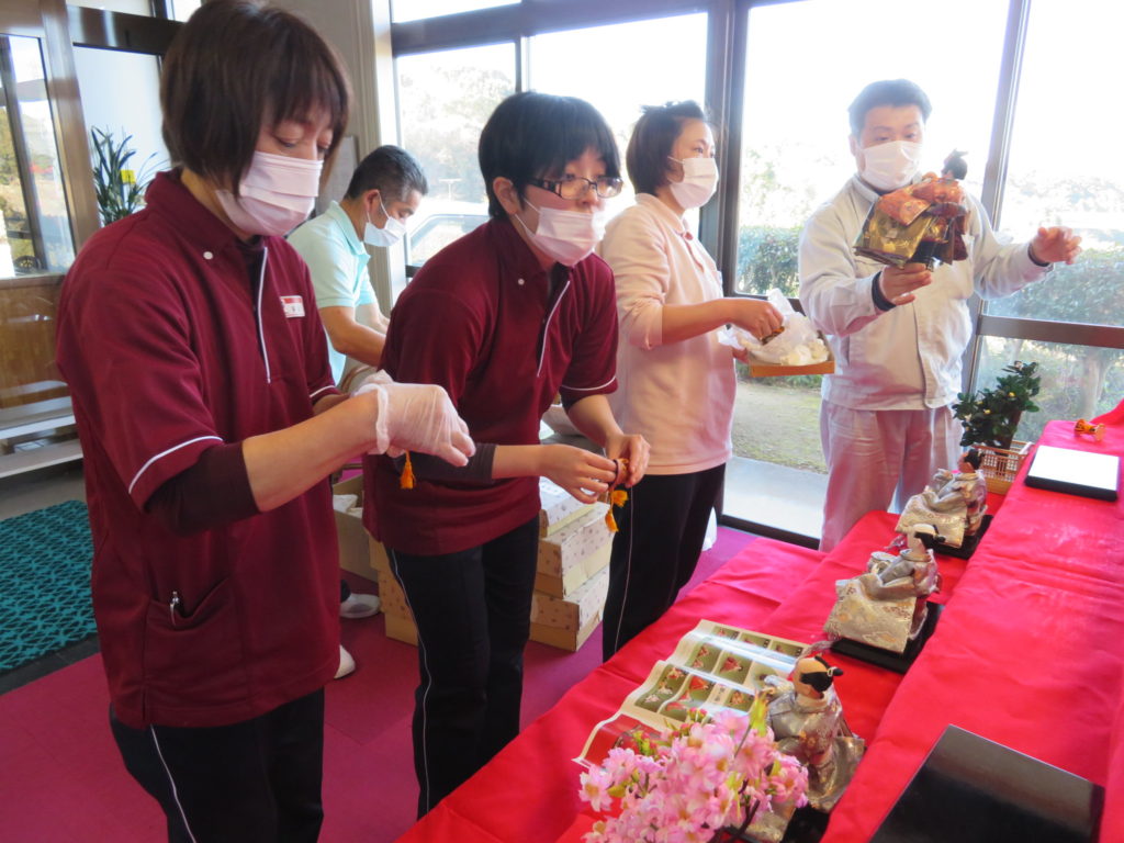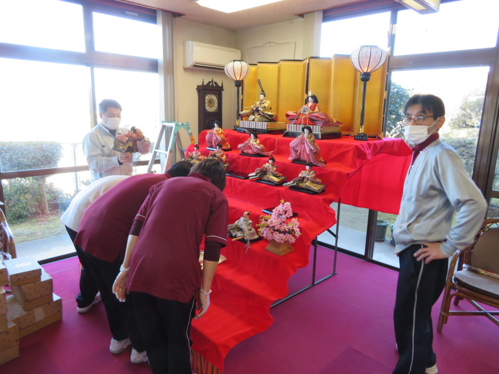 久しぶりの雛段人形飾りつけに、初めての職員ばかりで悪戦苦闘(。>︿<)_θ