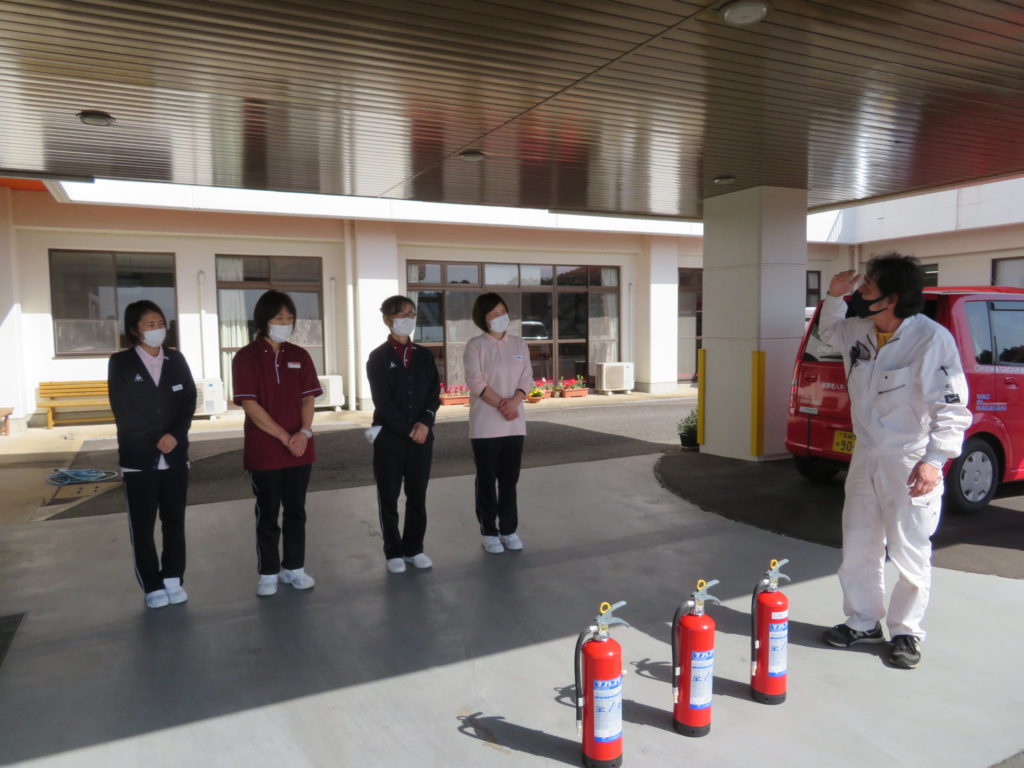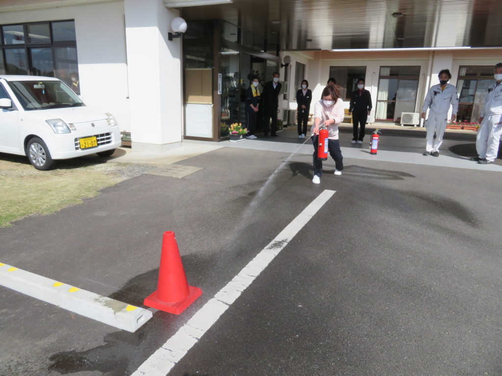 訓練終了後、業者の方指導にて水消火器を用いて初期消火訓練を行いました。