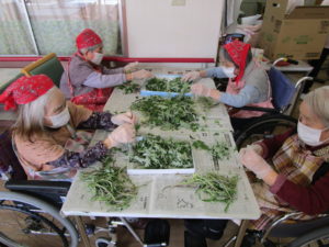 ヨモギ揃えの途中には「ヨモギのよか香りのする」「昔はヨモギ餅やヨモギ団子ば作りよった」と