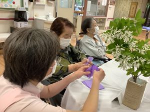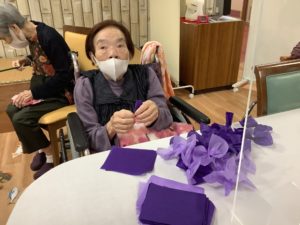 手作りクラブではフラワーペーパーで藤の花づくり(*^▽^*)