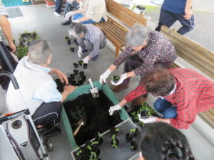 ポットに土を入れる方、苗を植えられる方とそれぞれ手分けされて作業を進められます🙌