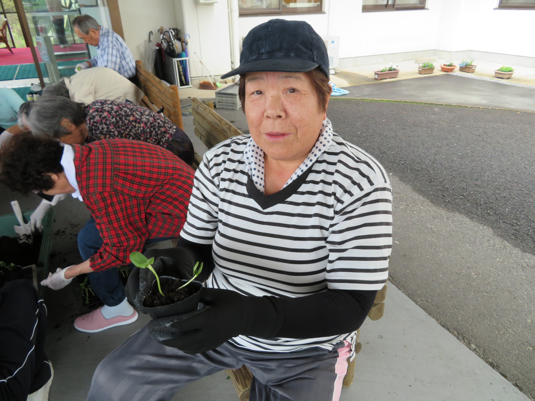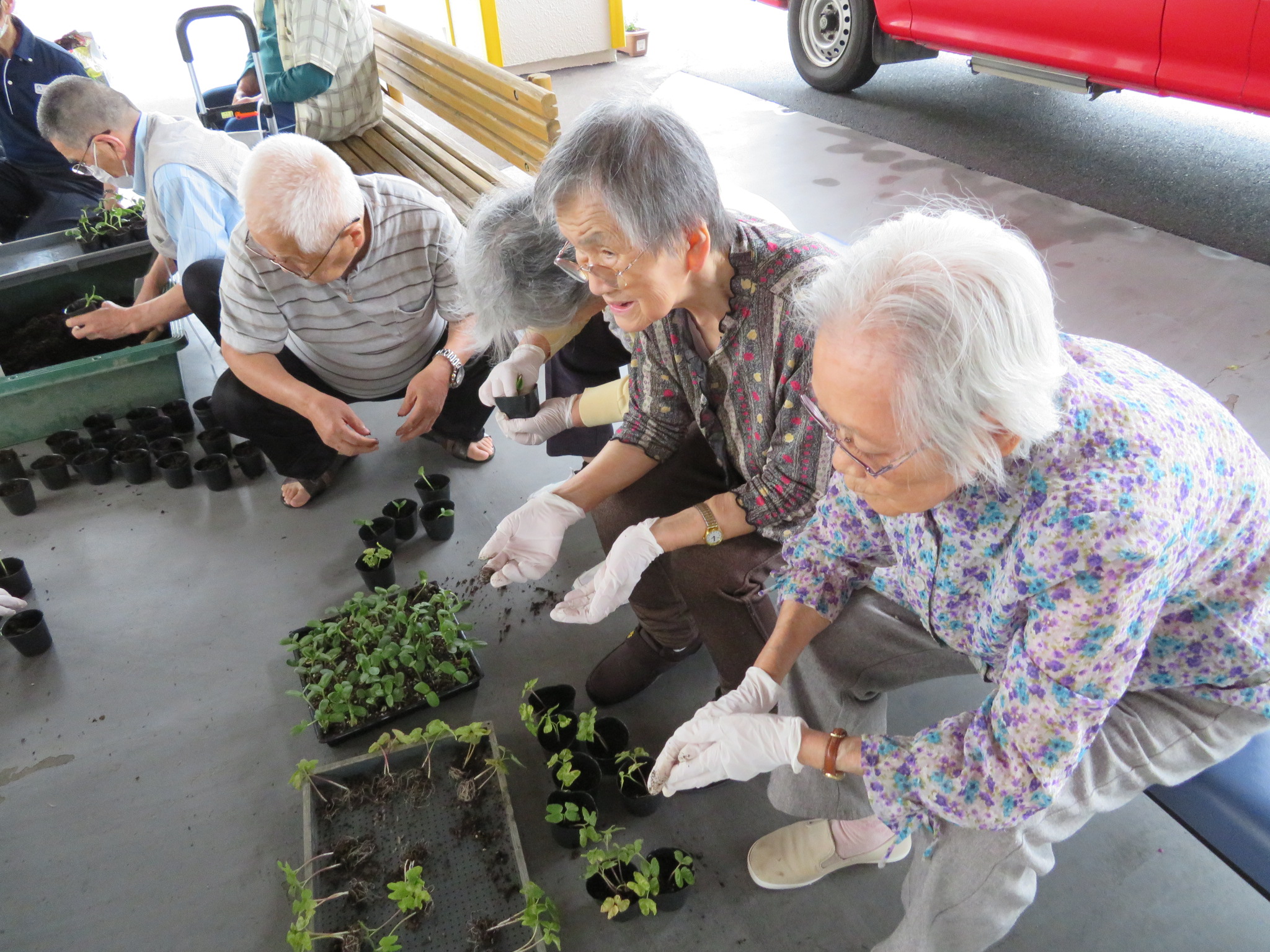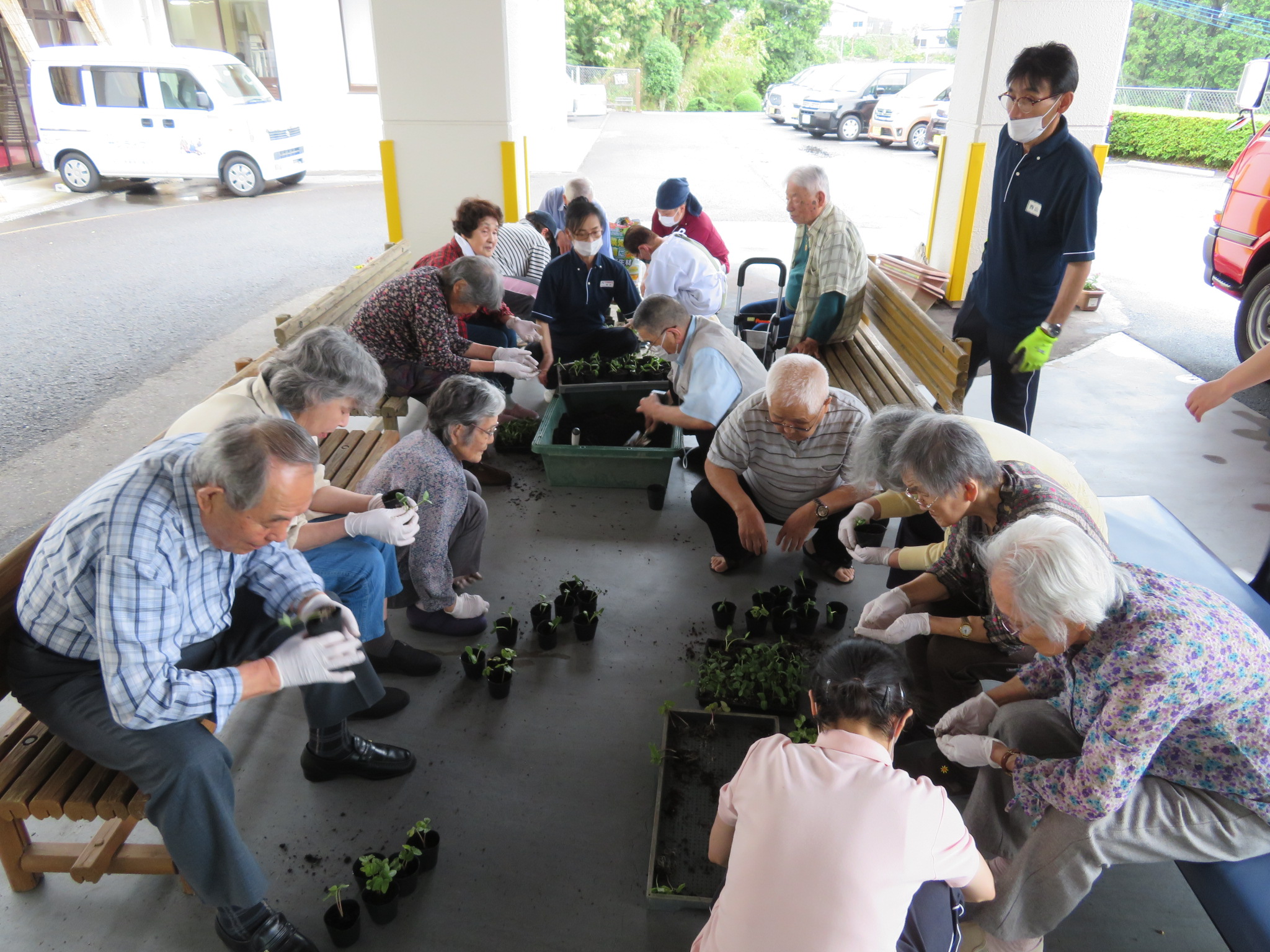 ポットに土を入れる方、苗を植えられる方とそれぞれ手分けされて作業を進められます🙌