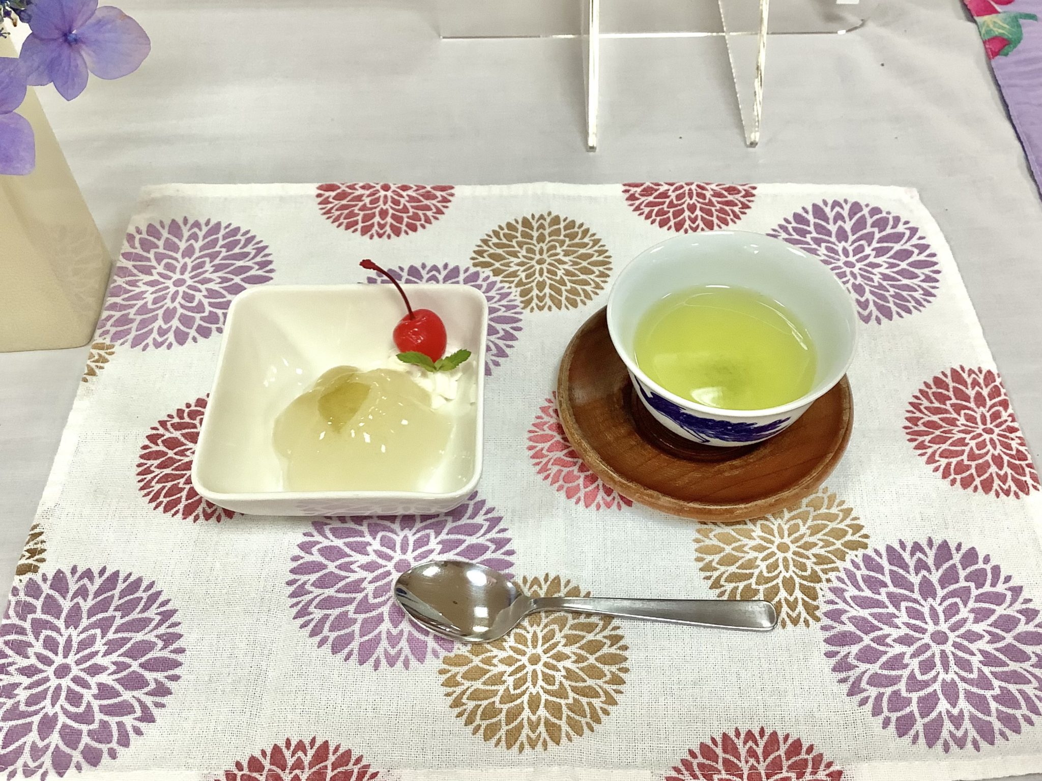 本日のおやつは、6/4に作った梅ジュースを使ったさっぱり梅ゼリーと緑茶🍵