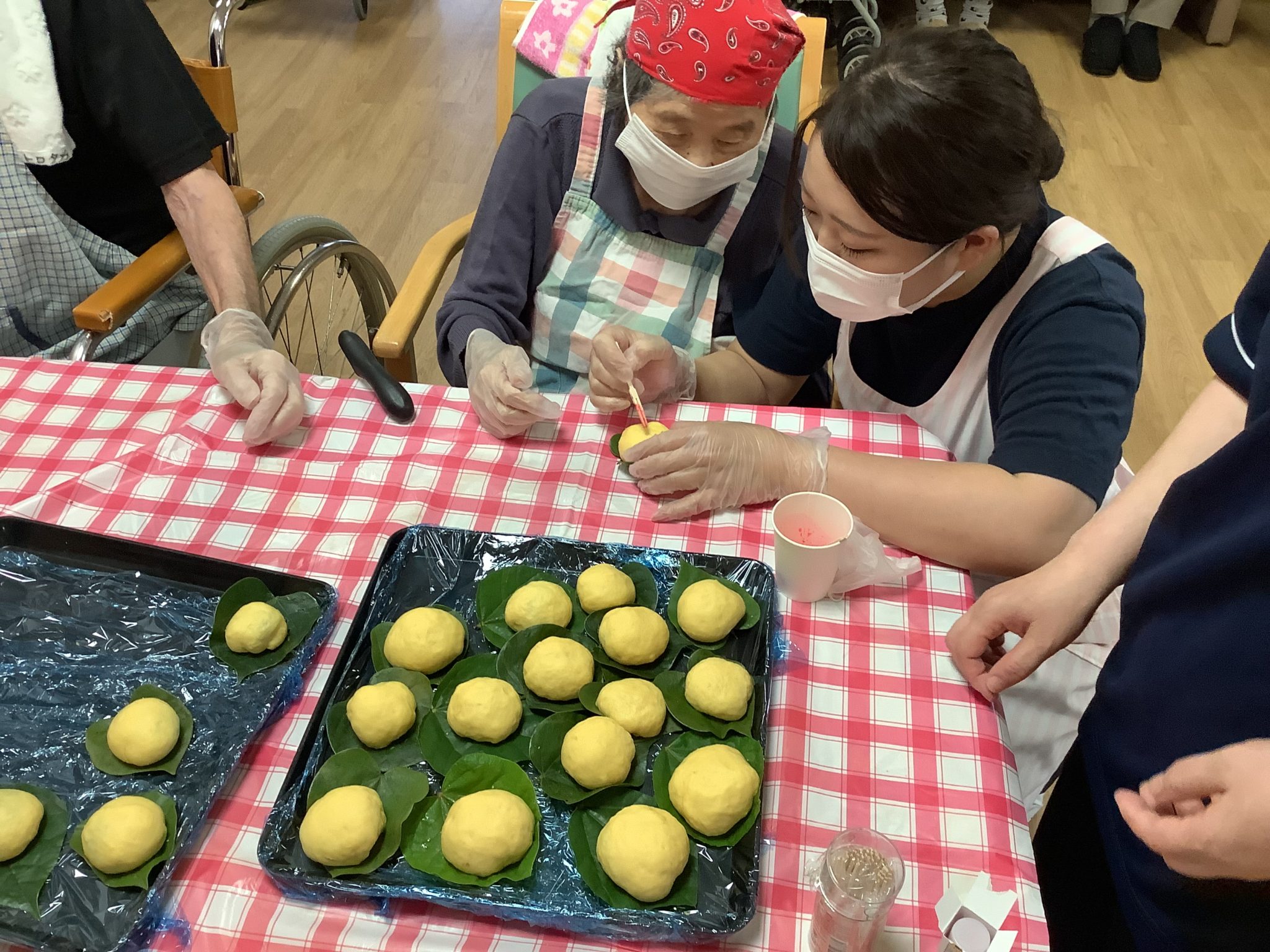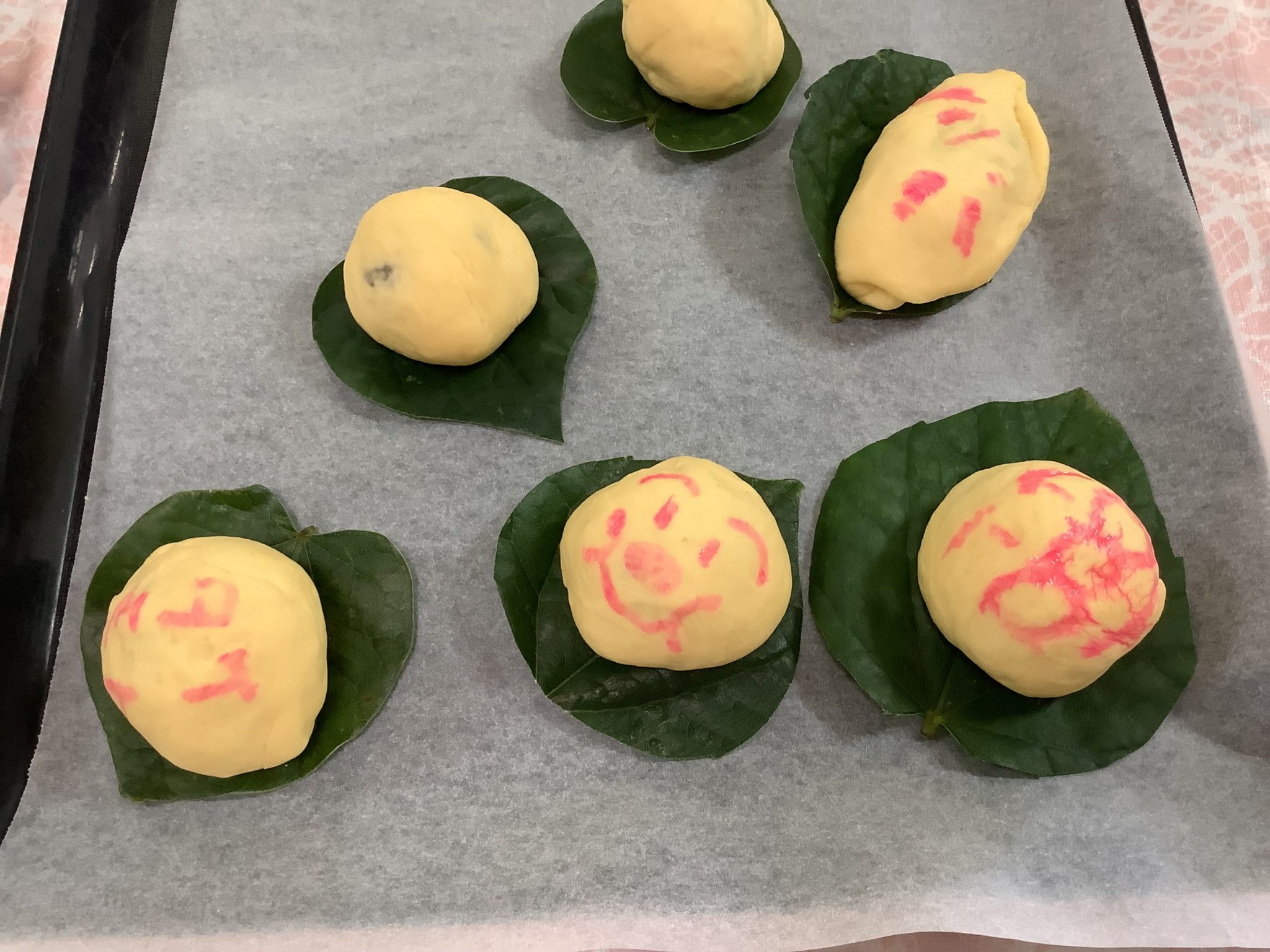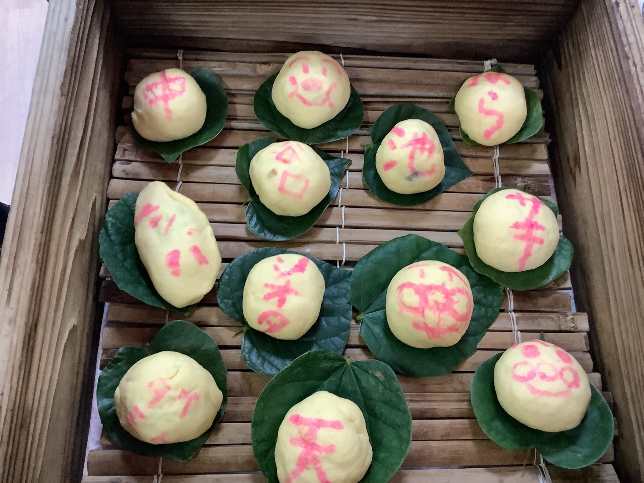 自分で作られたまんじゅうが分かるように 食紅で名前などを書いて頂きました
