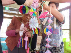 出来上がった作品は、七夕様の笹を再利用した枝に吊り下げて