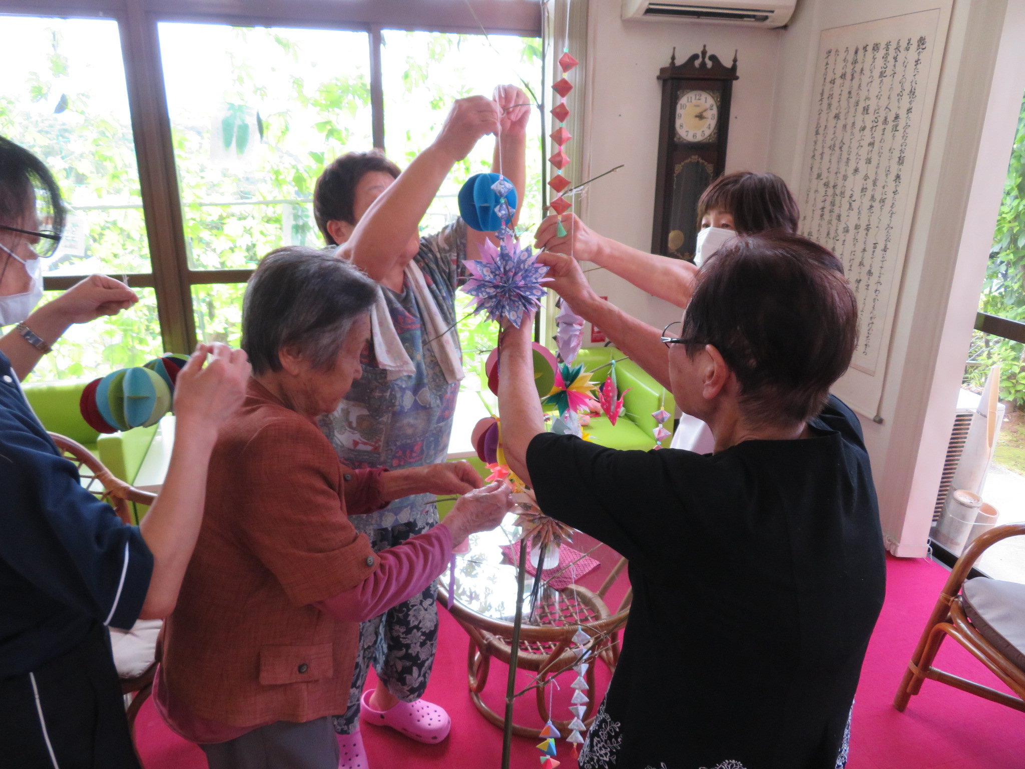 出来上がった作品は、七夕様の笹を再利用した枝に吊り下げて