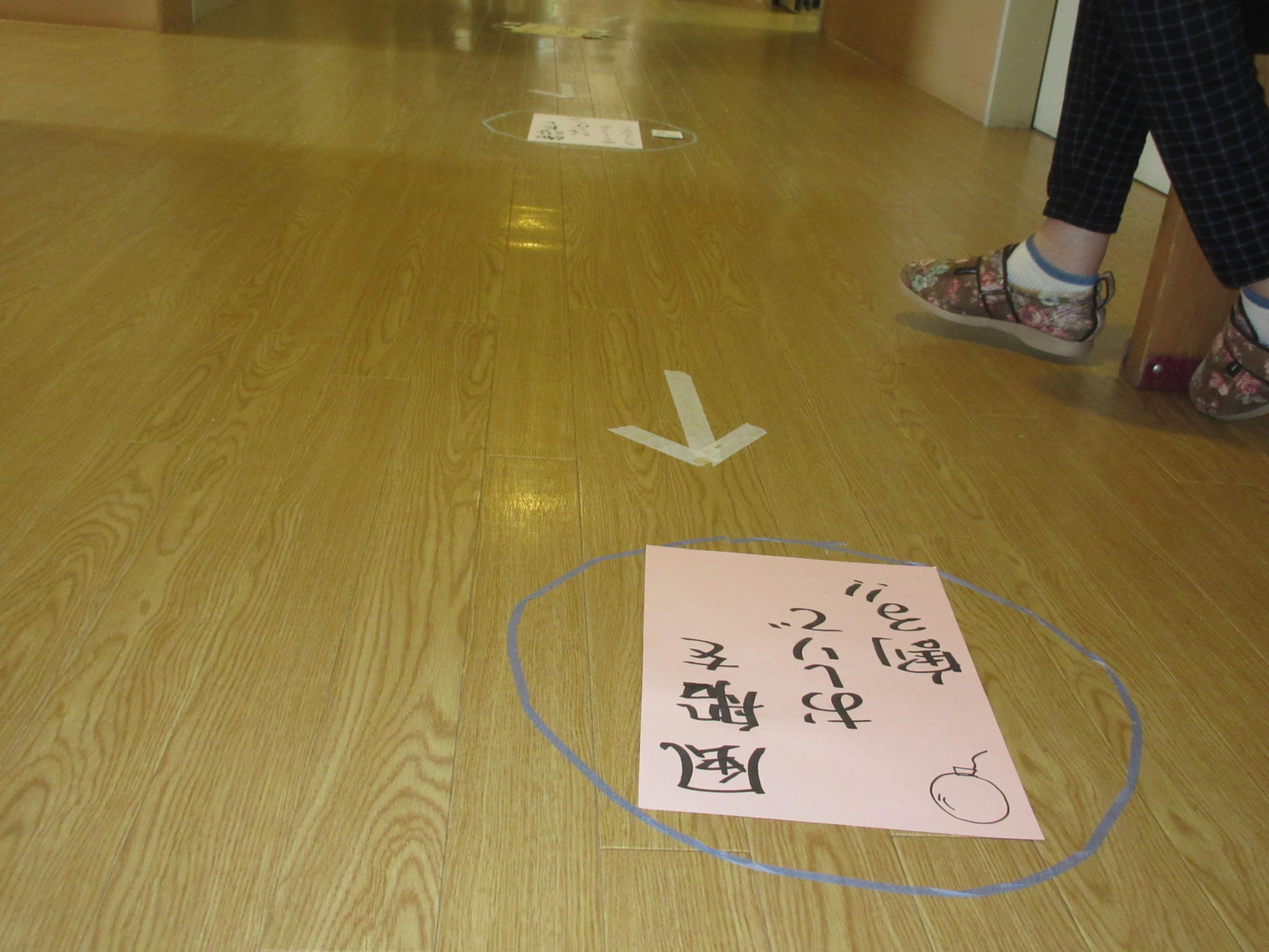 食堂から玄関までの廊下を使って、ゴールまでの順位を競います
