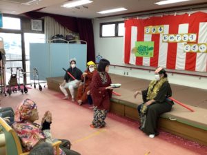 衣装は、職員のお手製ちゃんちゃんこと帽子です☆