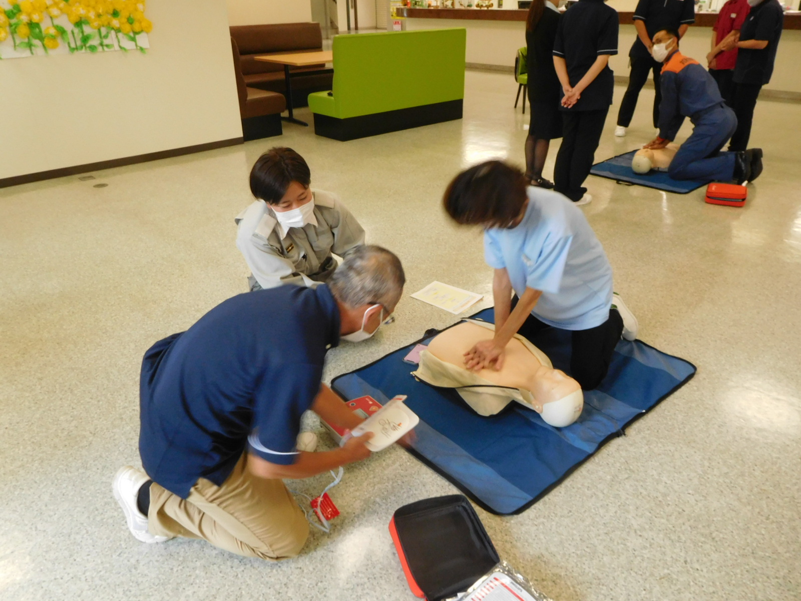 消防署より救急隊員の2名の方に来て頂き普通救命講習会が行われました。参加された職員の方々はDVDを視聴後、救急隊員の方に心肺蘇生法やAEDの使用方法の見本を見せてもらい、教えてもらいながら実践を通して救命方法について学びました。皆さん熱心な姿で一生懸命講習を受けられていました。時折笑い声も聞かれ和やかな雰囲気の中で終了しました。