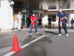 最後に、水消火器を用いて初期消火訓練を職員で行いました(●ˇ∀ˇ●)