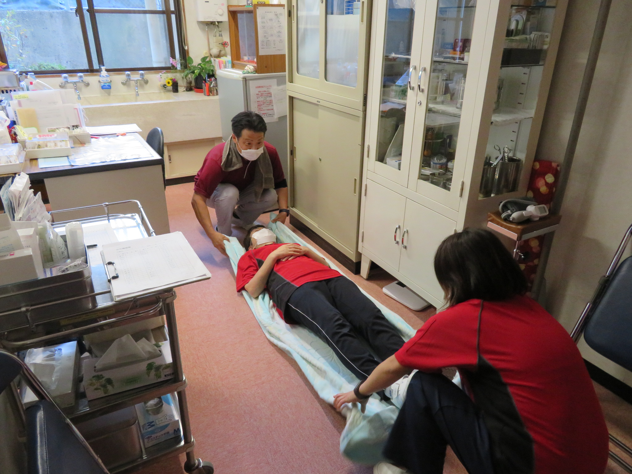 今回は、昼間に地震が起こり医務室の戸棚が倒れ、職員が下敷きとなり