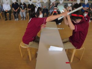 じゃんけんに勝ったら棒で相手の頭を叩いて、負けた方は、頭を守る!!