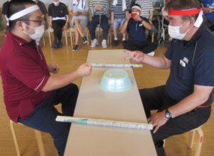 白組と紅組に分かれて、棒を使って隣の人にタオルを渡していきます❕❕