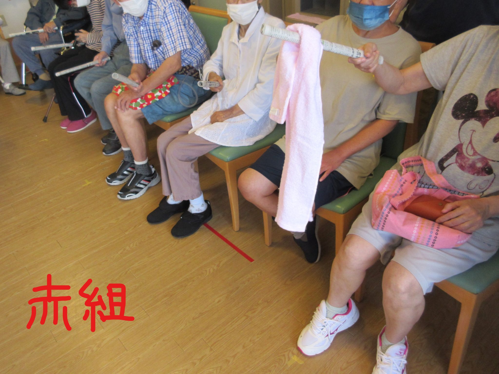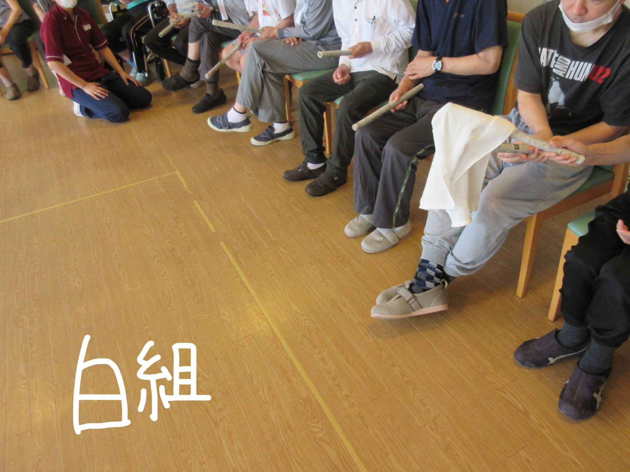 第1種目目は、利用者様全員によるタオルリレー
