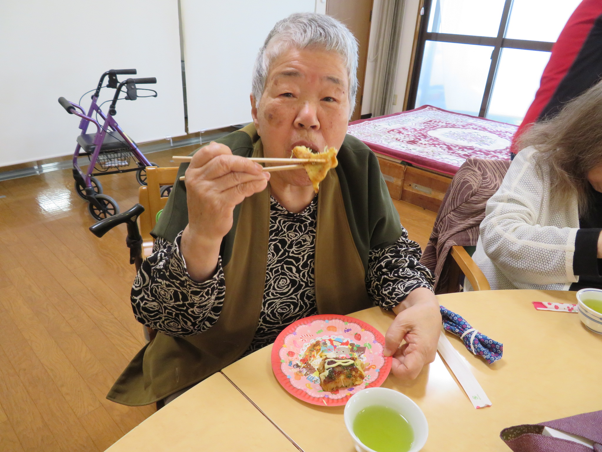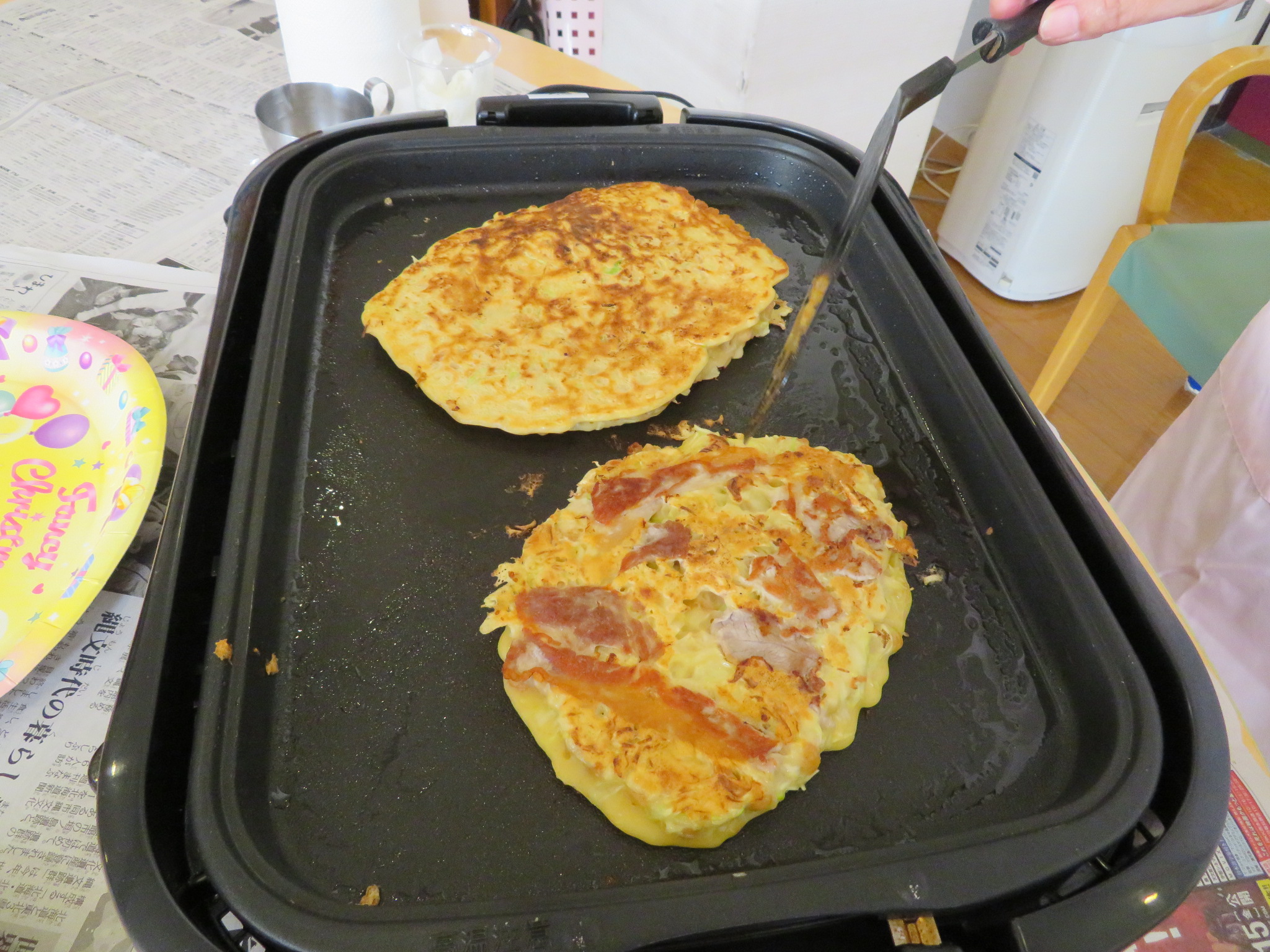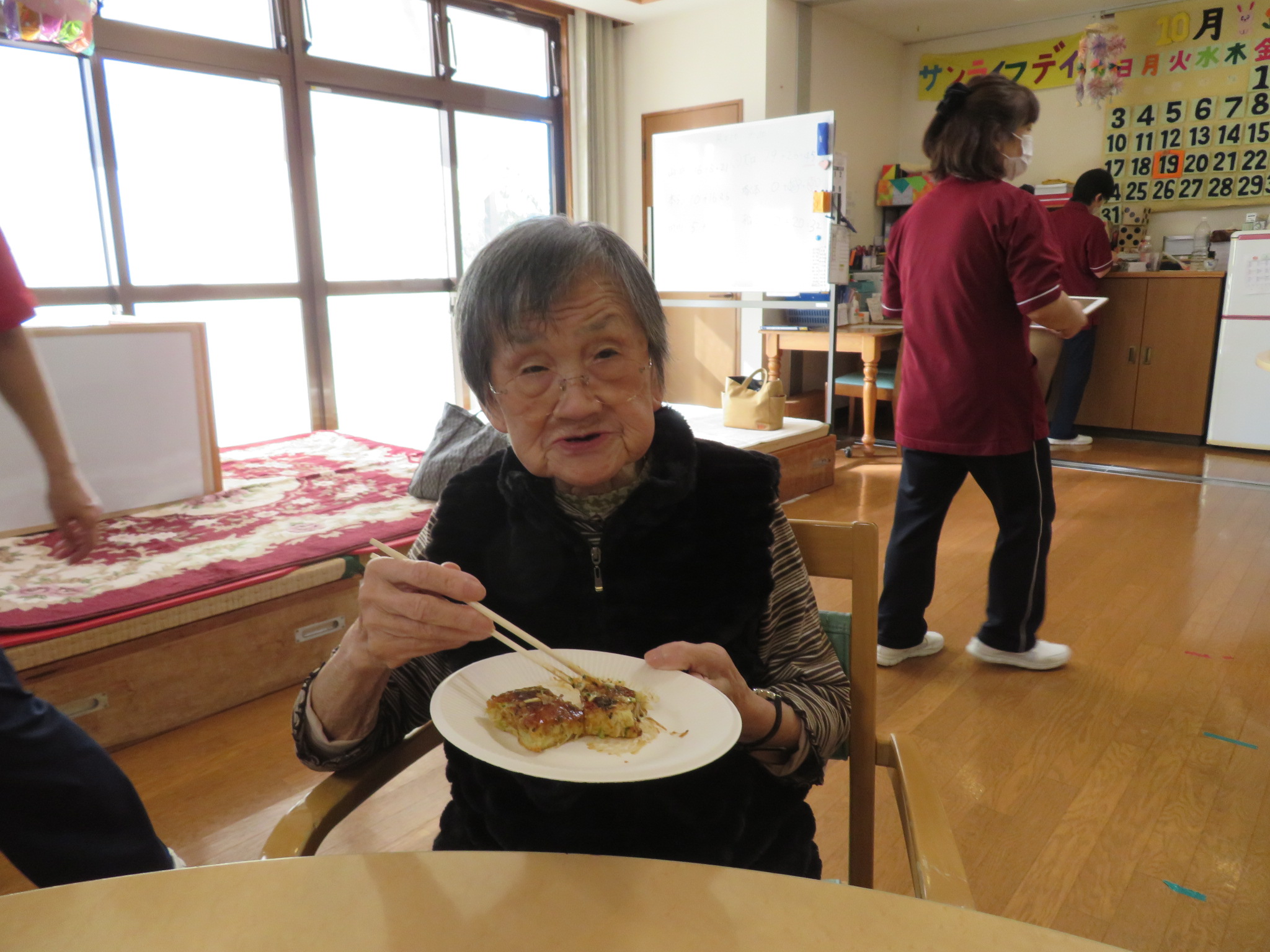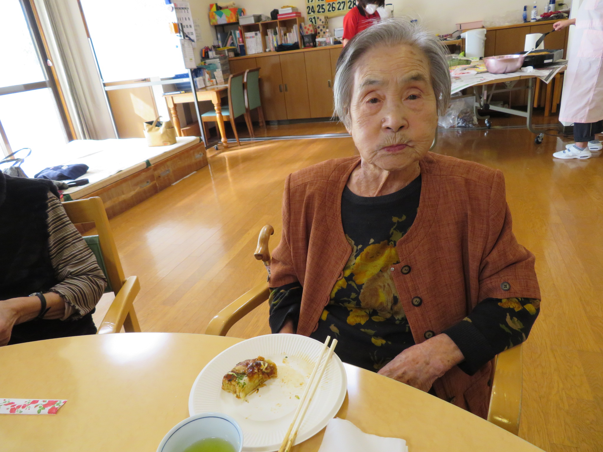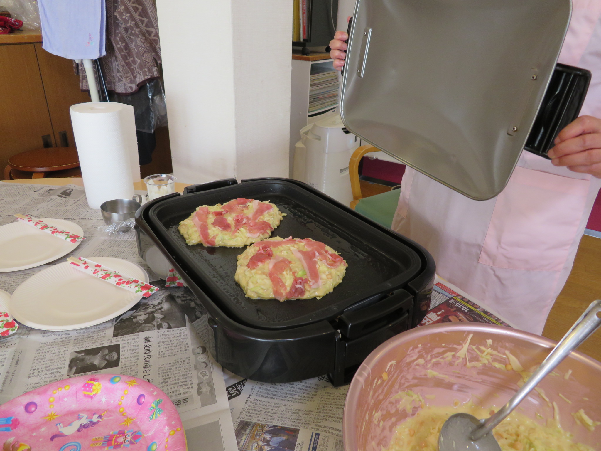 本日のおやつは、お好み焼きです。生地作りから、利用者様にお手伝いいただきました🎵
