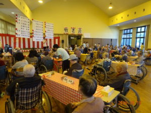 また、今年は喜寿から上寿までのお祝いする方が多く全部で23名の方を職員、利用者の皆様でお祝いしました。ひな壇に上って頂いて賞状をお渡しし、すごく喜ばれていました。中には恥ずかしかったのか「行かんよ~」と、お席から動かれない方もいましたがお席での贈呈をしました。後で話しかけると「もらったとよ~、よかろ~!」と自慢げに話されていました。