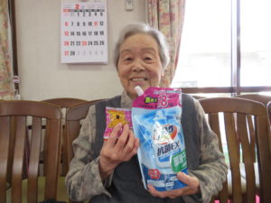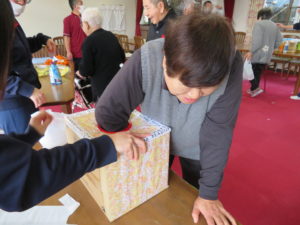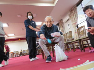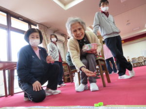 「ピンポン玉入れゲーム」では、ペットボトルの蓋を10投して点数に応じてお菓子のプレゼント