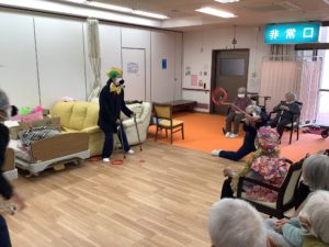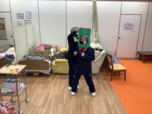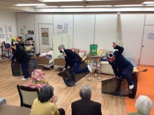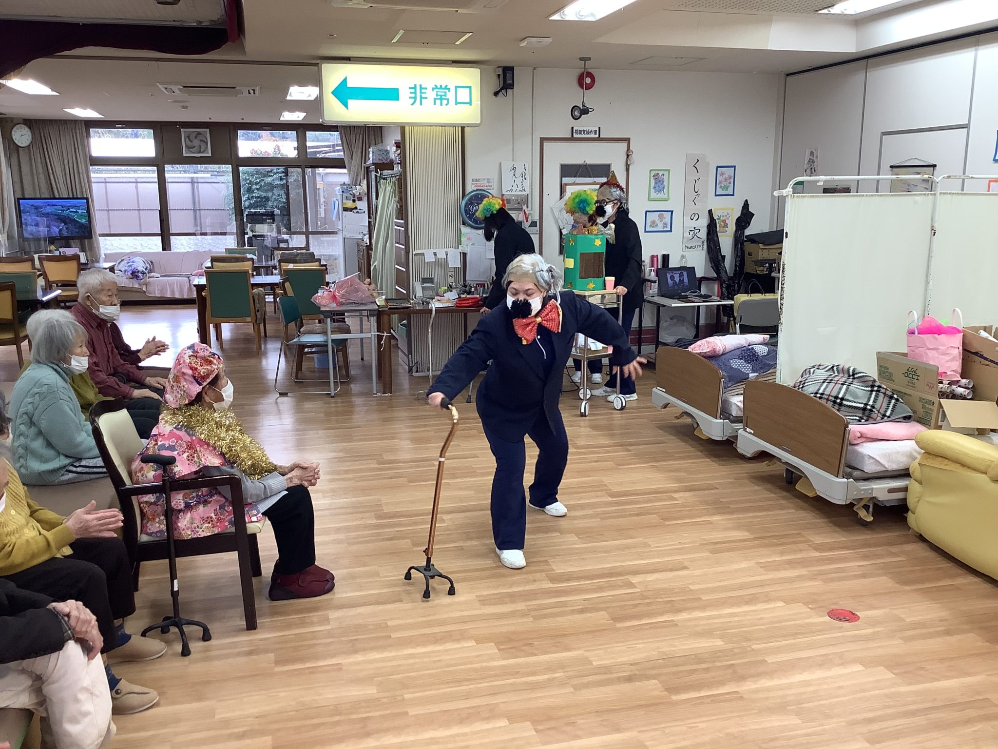 職員の余興のスタート!ドリフターズのあの音楽に乗せて~♪ヒゲダンスで登場です(*^^*)