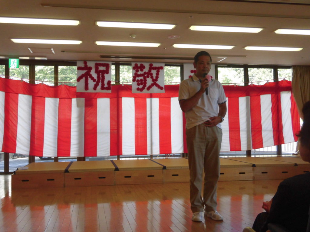 さて、そんな人生の大先輩たちを前に施設長が、職員を代表して、ご利用者の皆様にご挨拶させていただき敬老会の開催です。