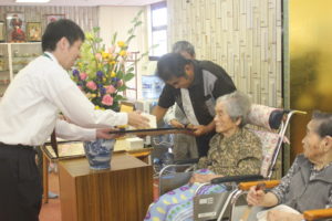 節目を迎えられた皆様をご紹介し、施設からのささやかなお祝いの品と職員からのメッセージカードを贈呈させていただきました。