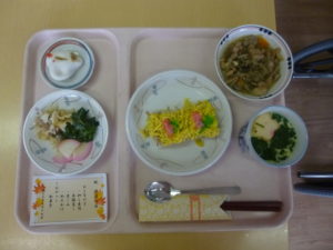 この日の昼食には押し寿司と茶碗蒸しなどの祝膳(手作りのおしながきと祝いの箸袋付き)をご準備いたしました。