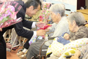 節目を迎えられた皆様をご紹介し、施設からのささやかなお祝いの品と職員からのメッセージカードを贈呈させていただきました。