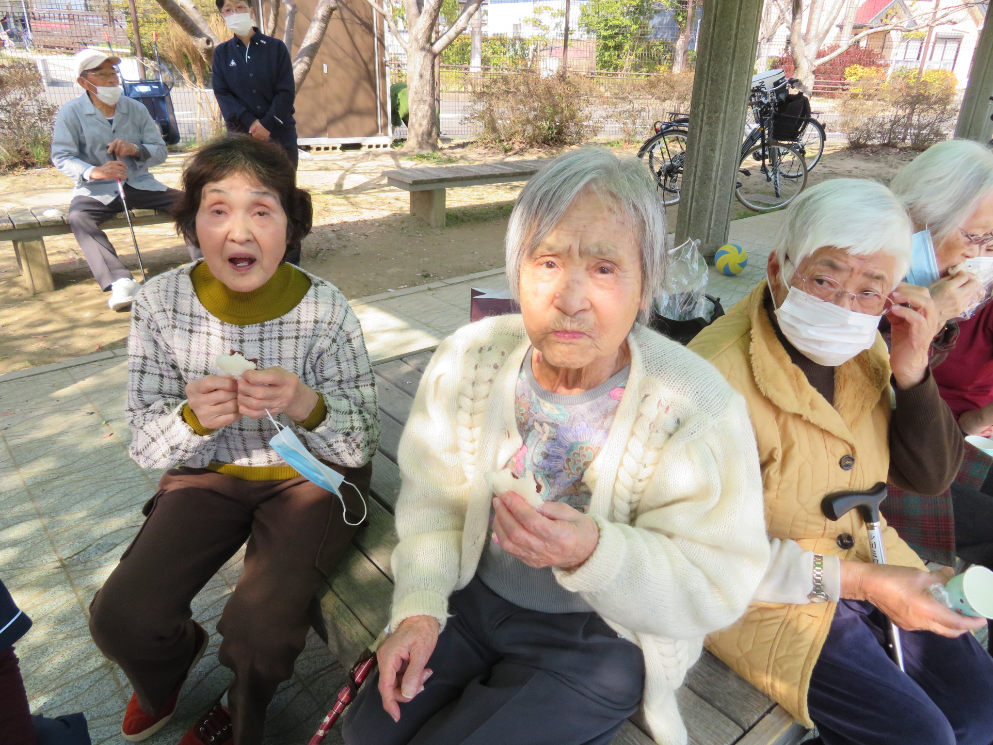 おやつは、外でお饅頭をいただきました♪(´▽`)
