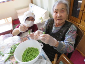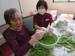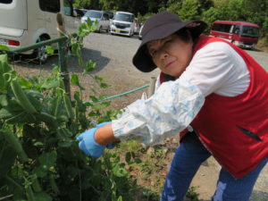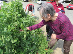 5/2(月)午後から、施設裏手にある畑のグリンピースを収穫しました