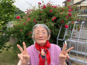 くじゃくの家入り口に植えているバラとツツジが綺麗に咲いていたので花の前で記念撮影📷✨