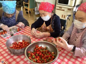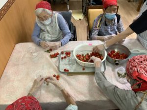 「あら、可愛らしか大きさね~」「美味しそうね~」と慣れた手つきでボウルいっぱいの苺もあっという間(*´▽`*)