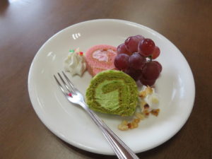 今回のお菓子は「2種のロールケーキ生クリーム添え、デラウェア」です。🍰🍇