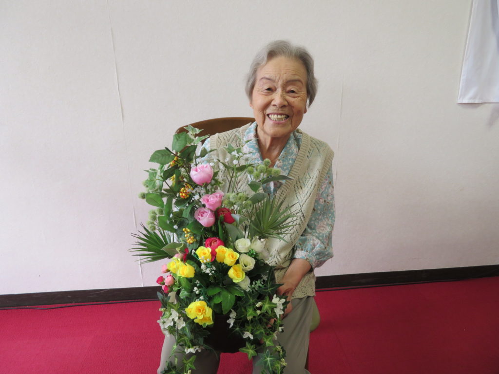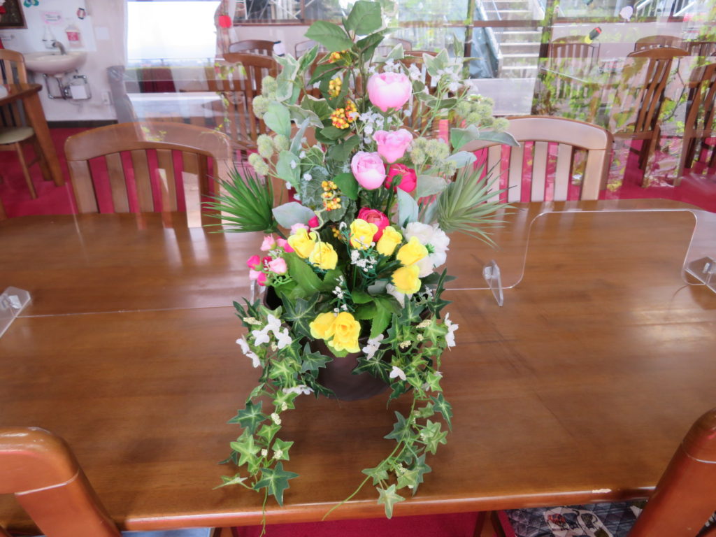 7/17(日)入居者様が作られた、造花のアレンジを食堂に飾って下さいといただきました🎵